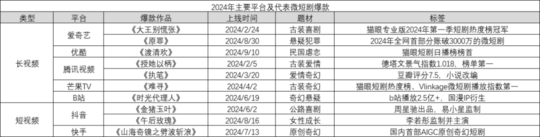 (圖表2,各長短視頻平台2024年微短劇代表作,數據來源:互聯網公開收集)
