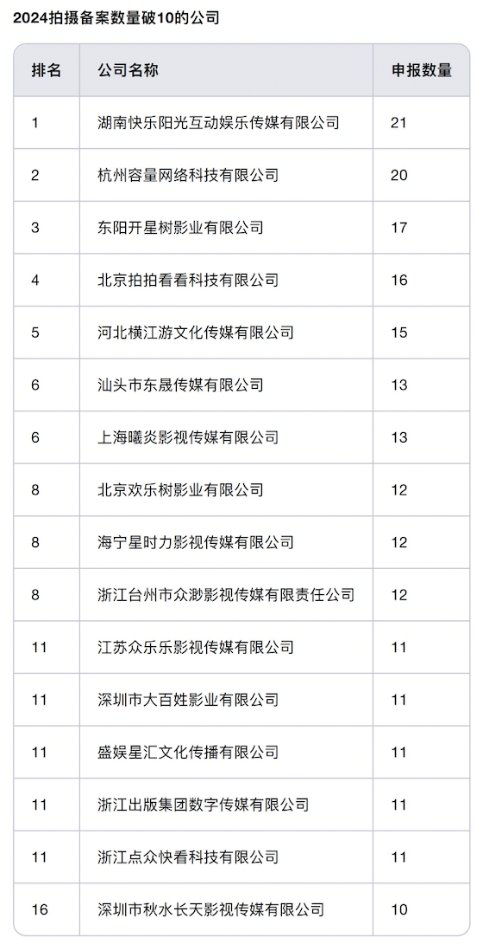 (圖表4,2024拍攝備案數量破10部的公司,數據來源:重點網絡影視劇信息備案系統,數據截止2024年12月31日)