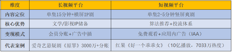 長視頻平台依託IP儲備打造精品化短劇,而短視頻平台則憑藉算法優勢主攻碎片化爽劇,二者在內容形態與商業邏輯上區別明顯。