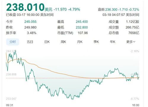 但和呂不韋當政秦國十二年不同,不到三個月,特斯拉股價已經抹平特朗普當選以來的全部漲幅。截至北京時間3月18日,特斯拉美股收盤股價報238.010美元,股價下跌4.79%,市值跌落至7656億美元。