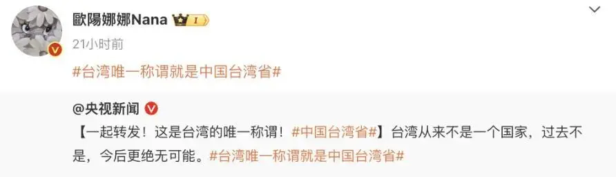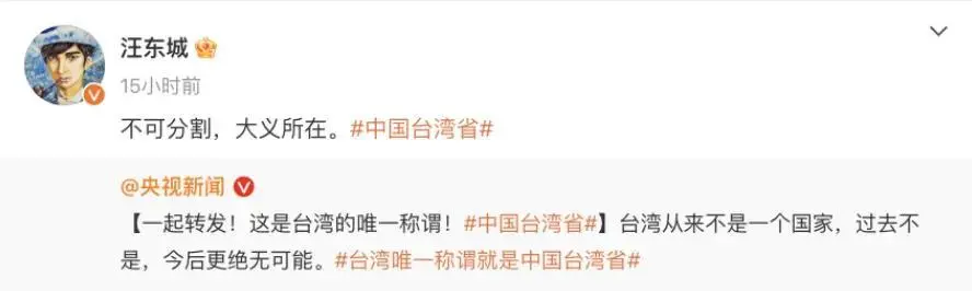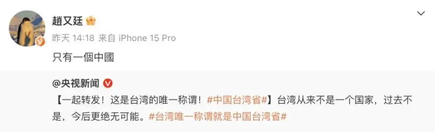 台海時刻2025年03月18日 18:05:58102人蔘與20評論中共中央政治局委員、外交部長王毅在兩會記者會上表示,“台灣在聯合國的唯一稱謂就是‘中國台灣省’”。隨後,包含侯佩岑、歐陽娜娜、趙又廷、陳妍希等多名台灣藝人在微博轉發央視的“台灣必歸”帖文,並獲得兩岸網友的點贊,但台當局隨後叫囂將查處上述台灣藝人是否具大陸身份證件,若持有的話,會註銷他們的台灣身份,引發島內輿論爭議。