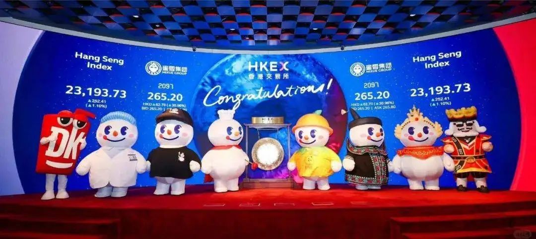 蜜雪冰城近幾年的病毒式傳播,基本都得歸功於雪王IP的打造,先是推出動畫、創作洗腦宣傳曲,在香港敲鐘的時候都是雪王親自上陣。