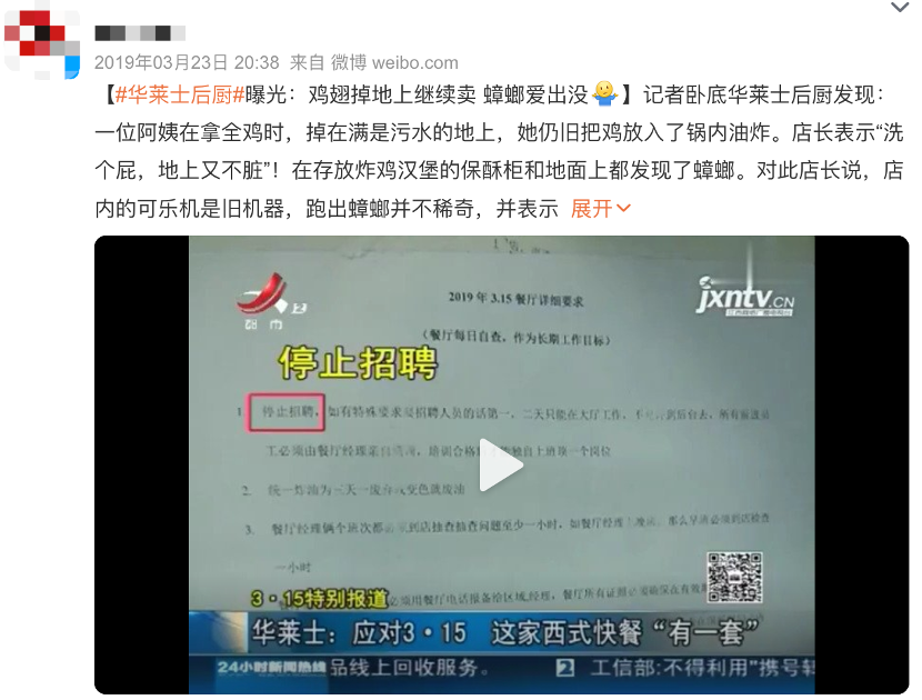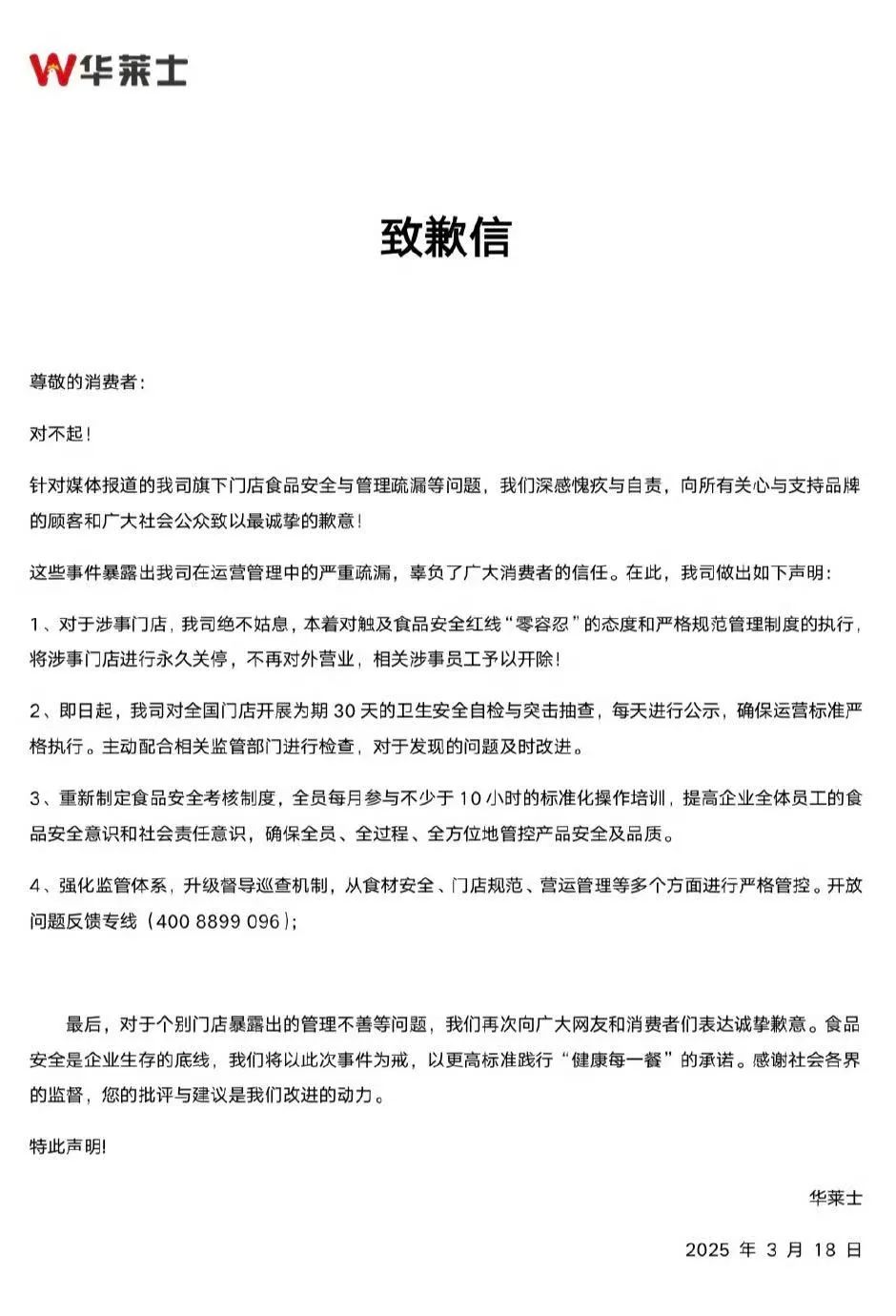 就在今天,華萊士就被曝光一事發佈道歉信,並且宣佈永久關閉涉事門店,開除相關店員,並針對全國門店開展30天的衞生安全自檢與突擊抽查。