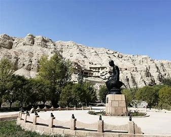 石窟寺前,佇立着佛學大師鳩摩羅什在蓮台上冥思的塑像。