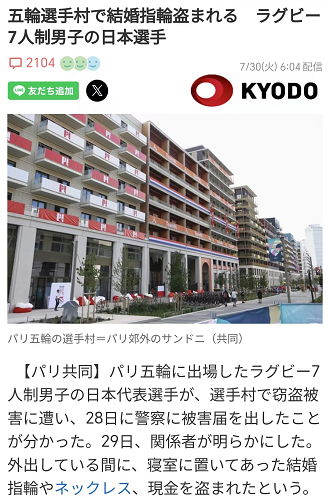 就在去年夏天的巴黎奧運會上,日本男子七人制橄欖球運動員在奧運村裏還遭遇了盜竊,不僅放在卧室的3000歐元現金不翼而飛,連最重要的結婚戒指都被偷走了。