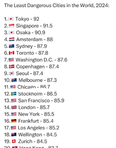 而在2024年全球最安全城市排名中,東京和大阪分別位於第一和第三。