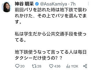 3月17日,東大校花神谷明採在推特上發文,稱在巴黎感受到亞洲人身處社會最底層,此言論一出,立刻引發日本網友的劇烈討論。