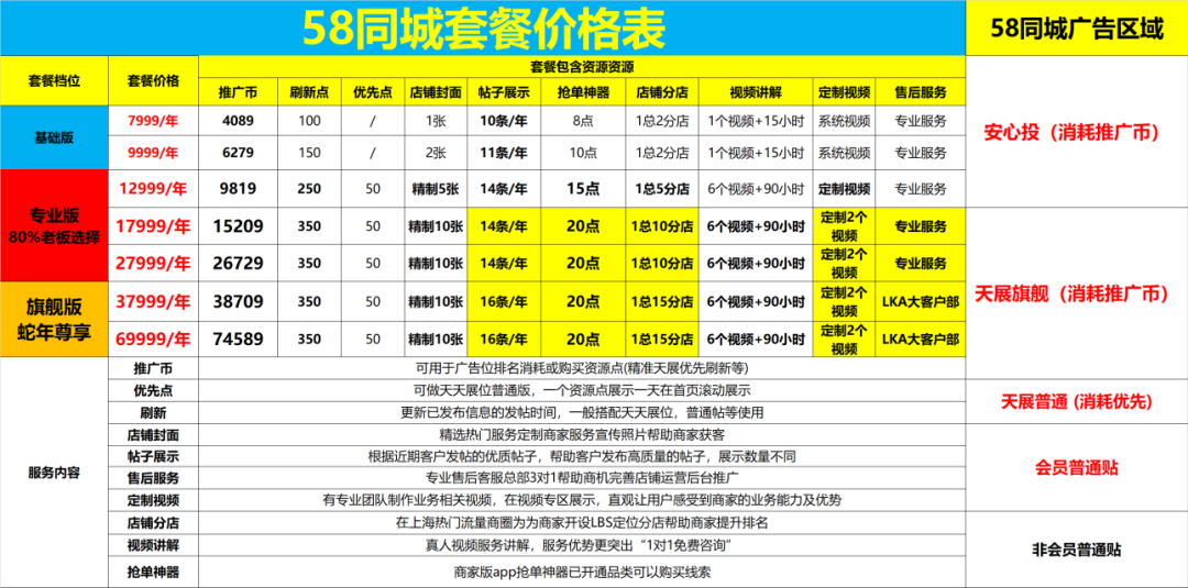 “58同城是按效果付費的,即按撥入電話付費,一通電話,差不多要30~40元。推廣成本直接從會員套餐中扣除,餘額用完了可以再充值。”羅秀向記者展示了一張“58同城套餐價格”表,共有基礎版、專業版、旗艦版的檔位,且資源差異較大。專業版每年有7999元和9999元兩種選擇,專業版每年的價格分別為12999元、17999元和27999元,旗艦版則是每年37999元和69999元。從信息來看,價格越高,推廣幣、優先點、帖子展示等資源就會越優。