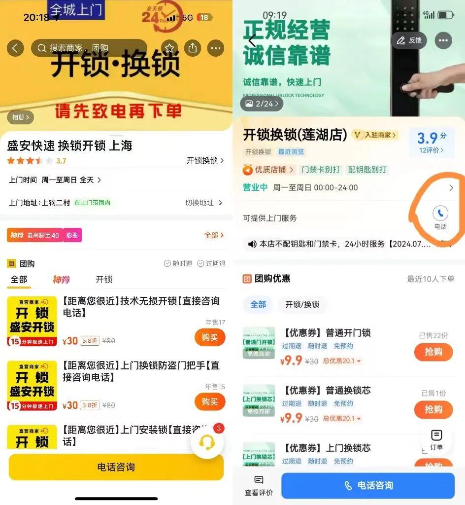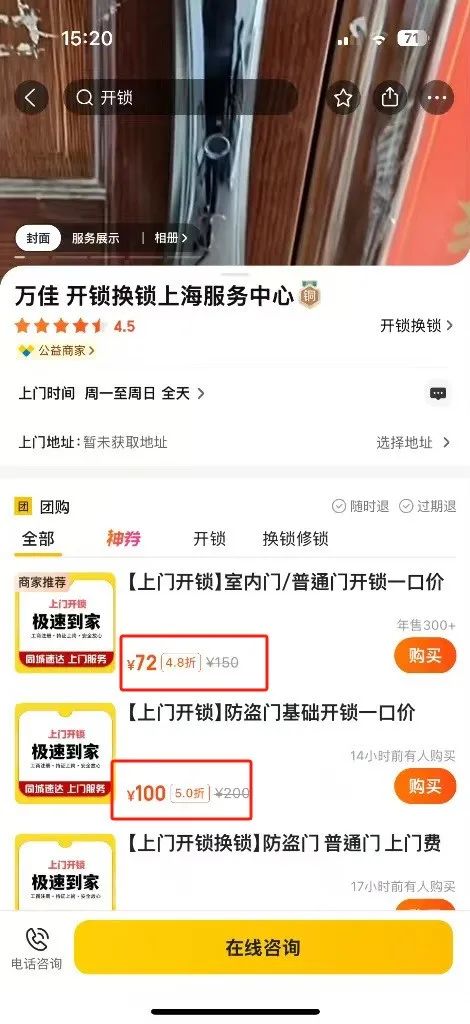 “只要顧客讓你去,就一切皆有可能。”前述業內人士張曉舟告訴《IT時報》記者,一般來説,當消費者需要開鎖時,會先在各種互聯網平台上以“開鎖”“開門”等關鍵詞進行搜索,然後挑選商家,並通過平台在線撥打電話,而商家要想接到單子,有時會在平台店鋪裏上線“低價團購券”,或者當消費者電話詢問時,報一個很低的價格,目的就是爭取上門,然後便有很大空間可操作。