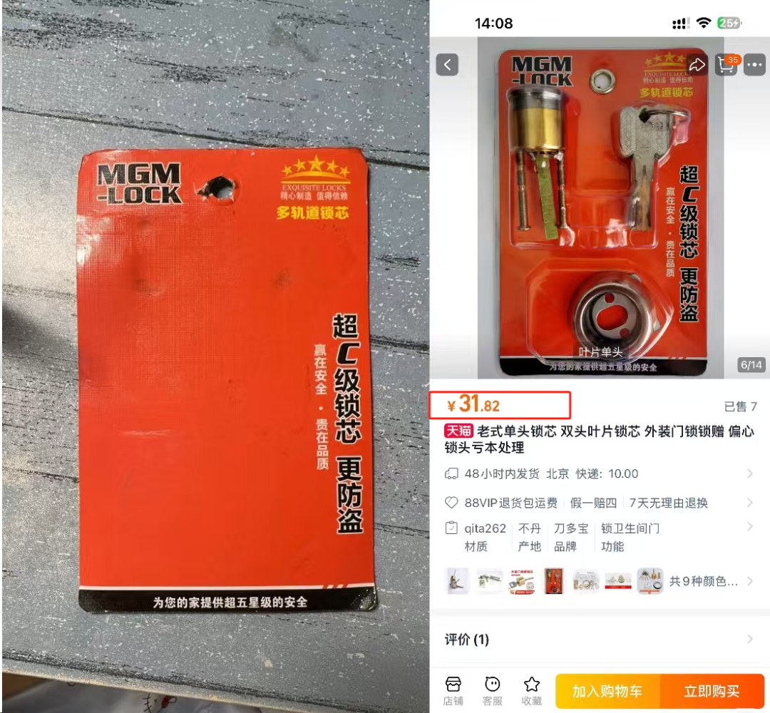 開鎖師傅為李曉更換的鎖具,是一款名為“MGM-LOCK”的多軌道鎖芯,在電商平台上的價格僅為30元左右,差價幾乎是20倍。