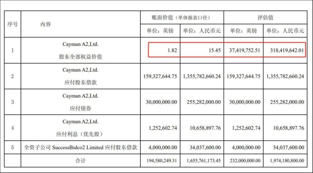 然而,截至評估基準日,Cayman A2歸屬於母公司股東權益人民幣15.45元,對應評估值竟然高達3.18億元。