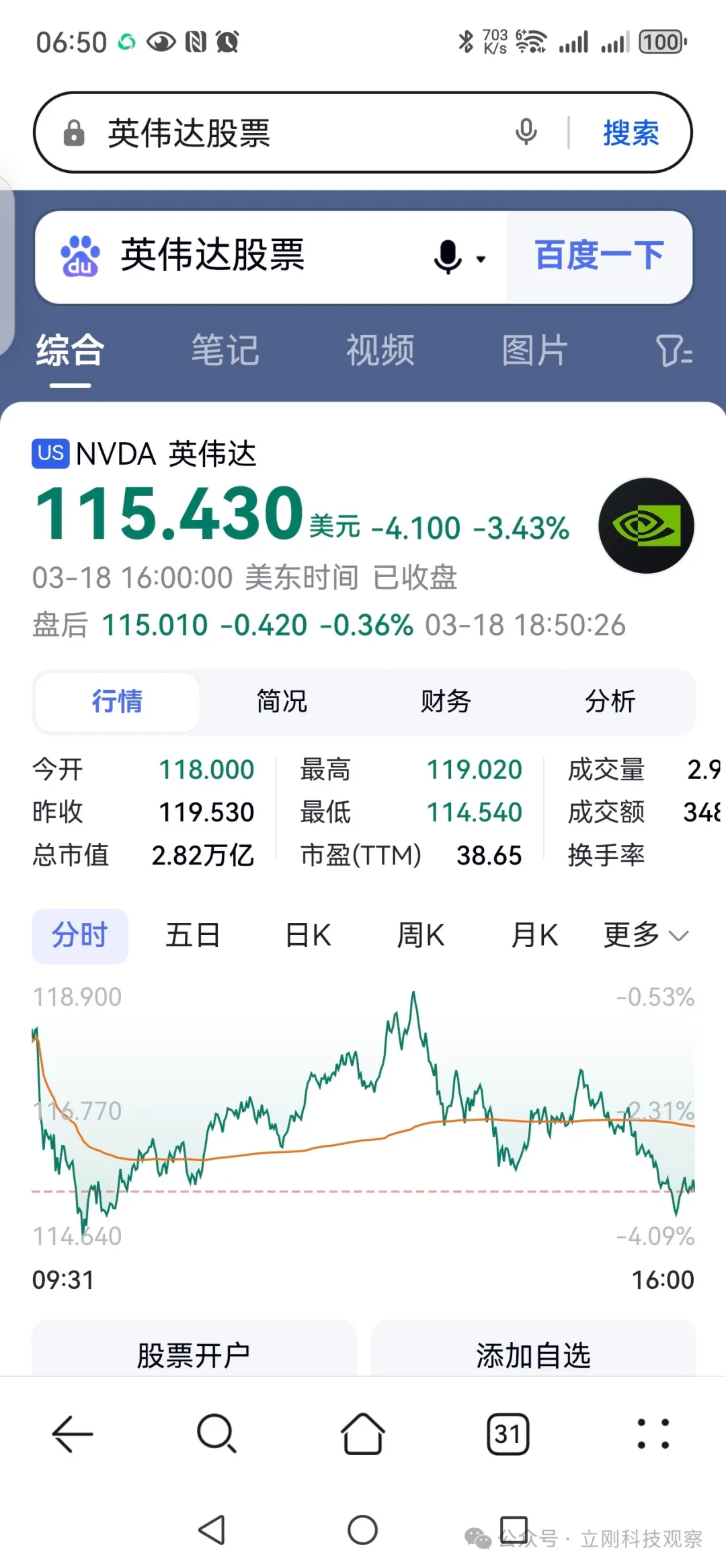 早晨翻一下英偉達的股價,因為英偉達GTC黃仁勳會有演講,推出新產品“BlackwellUltra”,這應該是重大利好,我想看看市場的反應。按照以往的慣例英偉達的股價在這樣的刺激下會有一定程度上漲,我想看看漲幅是多少,感知一下市場對英偉達是不是有點信心恢復。