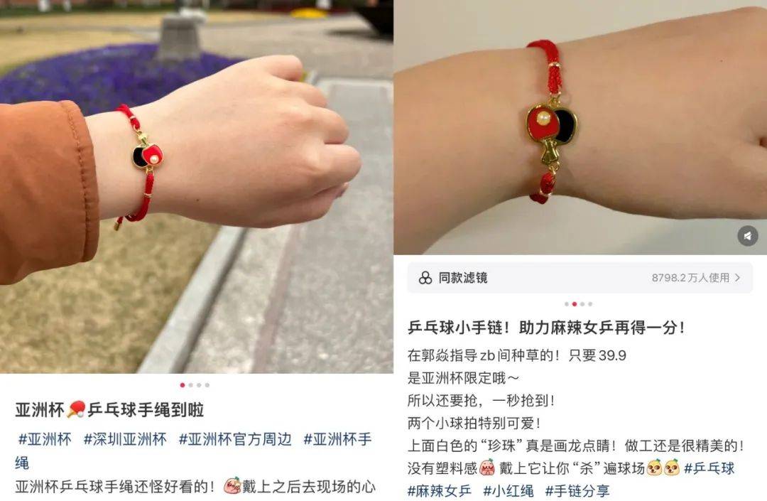 當款式簡約的手繩被巧妙嵌入乒乓球元素後,不僅成為觀眾席上最醒目的應援符號,也成了球迷在社交媒體上熱議的焦點——相關詞條討論量輕鬆超過百萬,時至今日再檢索有關內容,滿屏充斥的依舊是不勝枚舉的「買家秀」或求購信息。