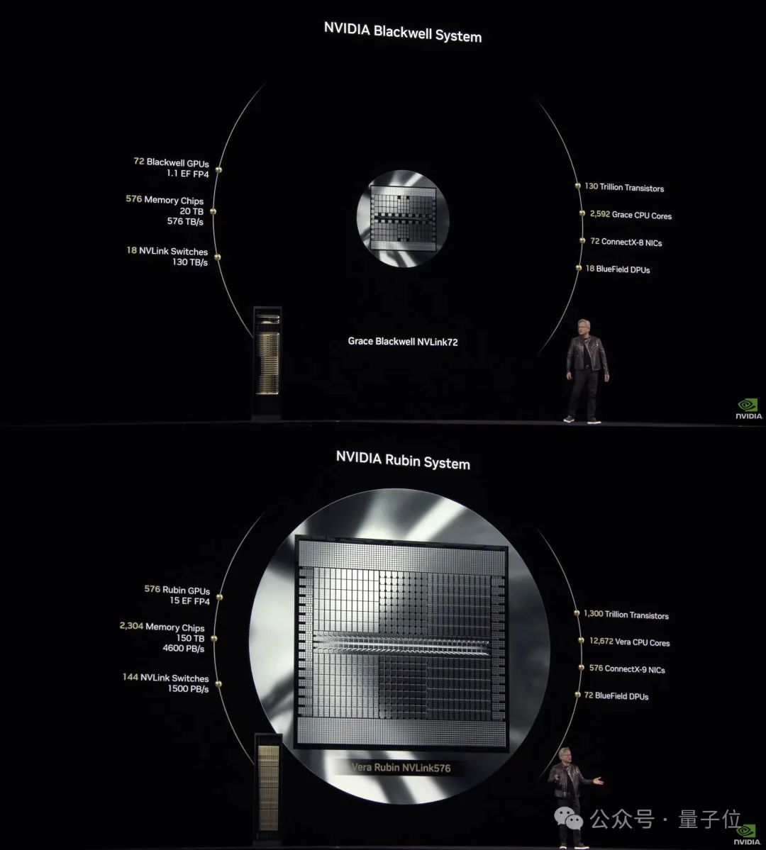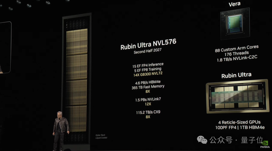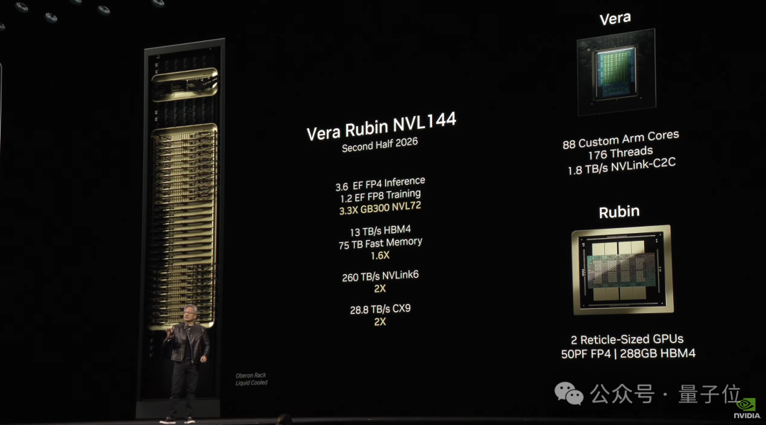 除此之外,老黃還預覽(2026年下半年發貨)了英偉達下一代AI超級芯片,名字大變樣——Vera Rubin。