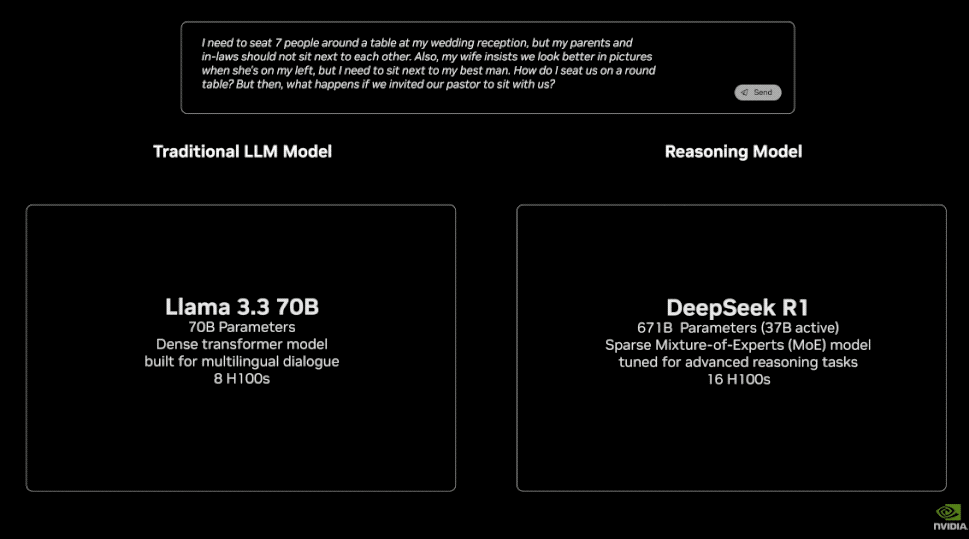 而老黃在現場體現傳統LLM和推理LLM的區別時,也是拿着DeepSeek-R1來舉例: