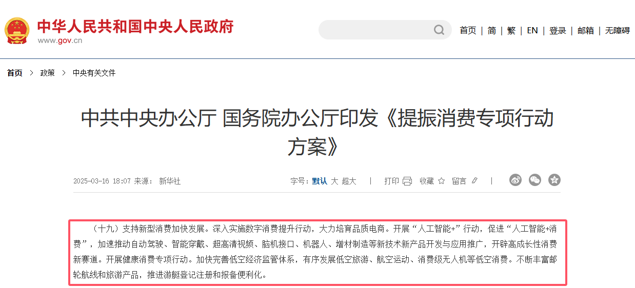 近日,中共中央辦公廳、國務院辦公廳印發《提振消費專項行動方案》(以下簡稱“《方案》”)。第十九條,提及支持新型消費加快發展。開展“人工智能+”行動,促進“人工智能+消費”,加速推動自動駕駛、智能穿戴、超高清視頻、腦機接口、機器人、增材製造等新技術新產品開發與應用推廣,開闢高成長性消費新賽道。