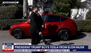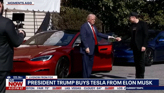3月12日早上,五輛嶄新的特斯拉在白宮南草坪車道上一字排開,特朗普與他的親密戰友馬斯克在鏡頭前寒暄一番後,雙雙坐進了一輛紅色的Model S,一場魔幻的新聞發佈會就這麼開始了。