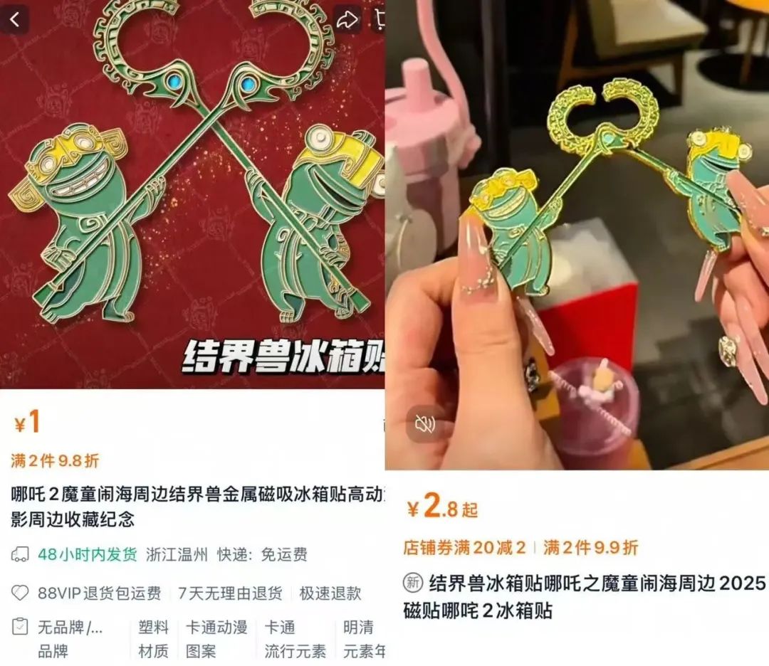 電商平台上,未經授權的盜版商品銷量同樣驚人,哪吒周邊店鋪近100 家,部分盜版商品售價僅為正版的 1/10,售價19.9元“結界獸冰箱貼”盜版銷量突破100萬元。中國反侵權假冒聯盟2025年1月報告顯示,《哪吒2》屬於盜版重災區,預估侵權商品規模達6-8億元。