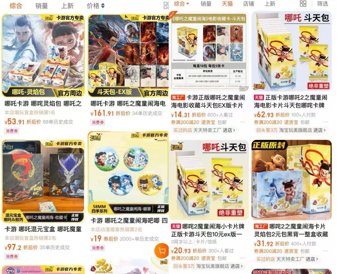 在電影影響力的帶動之下,《哪吒》的IP周邊產品也同樣火爆出圈。上映不足1個月,淘寶天貓上的《哪吒2》周邊商品成交額突破3億元;泡泡瑪特聯名款“天生羈絆”系列盲盒預售銷量超10萬件;線下商業的IP聯名此起彼伏;甚至出現了一吒難求的現象。