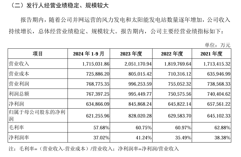 截至2024年9月末,併網裝機容量2820.69萬千瓦(風電2156.64萬千瓦佔76.5%,光伏664.05萬千瓦佔23.5%),綜合裝機規模位列國有新能源企業第四。其風力發電利用小時數(1731小時)較行業均值高出10.5%,凸顯運營效率優勢。