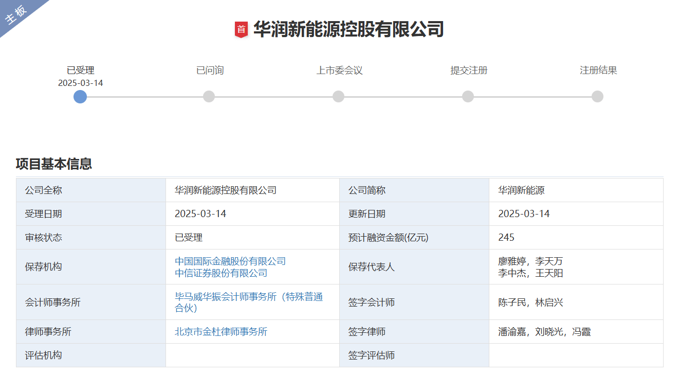 2025年3月14日,深交所正式受理華潤新能源控股有限公司主板IPO申請,標誌着這家新能源巨頭邁向資本市場的關鍵一步。