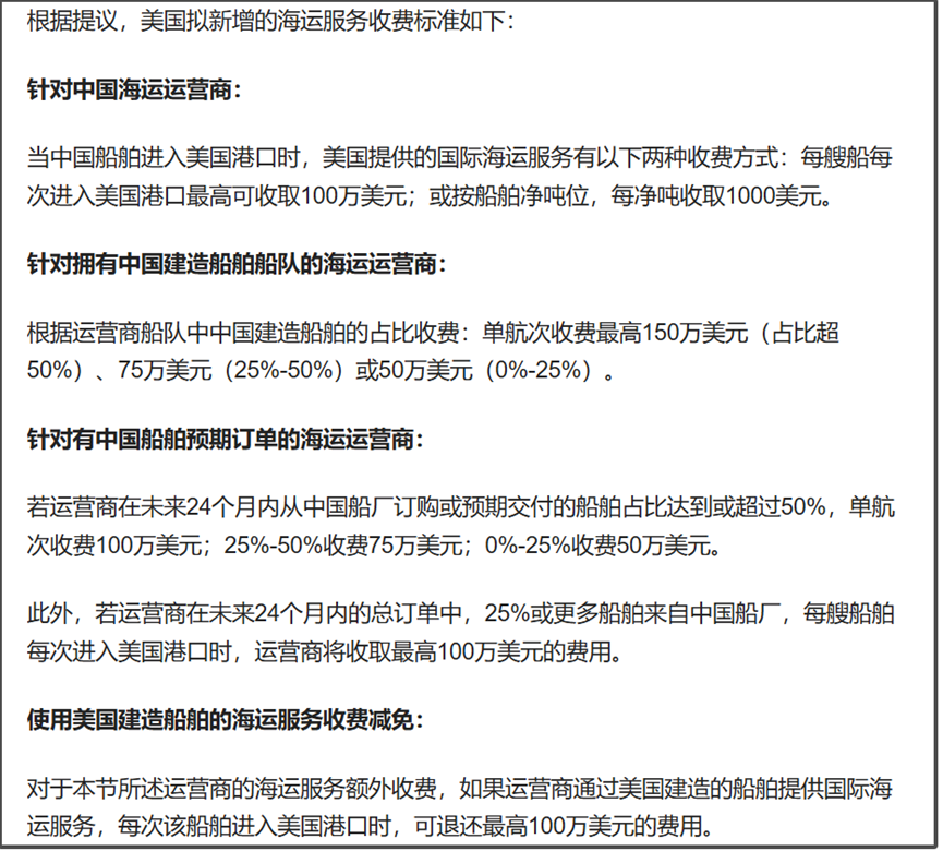 其中提到,若運營商在未來24個月內從中國船廠訂購或預期交付的船舶佔比達到或超過50%,單航次收費100萬美元;25%-50%收費75萬美元;0%-25%收費50萬美元。