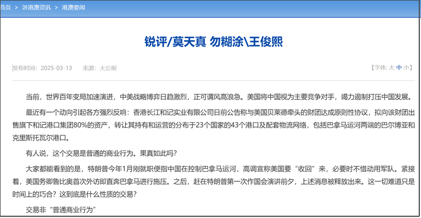大公報這篇報道還提到,“美國或將以這個交易為“範本”,通過政治施壓在全球範圍掀起港口併購,控制世界更多關鍵港口,並用“長臂管轄”實施打壓手段,讓中國船舶“無處可靠”。”