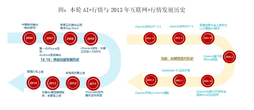 在十年前的移動互聯網時代,2010年至2012年智能手機滲透率突破50%後,2013年行情從上游通信設備(4G基站投資增速32%)啓動,2014年向中游軟件(雲計算市場規模+45%)延伸,2015年最終在手遊(市場規模+87%)、O2O(美團交易額+180%)等應用端形成爆發,完整週期歷時28個月。