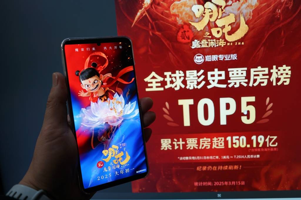 3月15日,上海的一位影迷查看《哪吒2》的海報和該片票房進入全球票房榜前5名的消息。 圖源東方IC