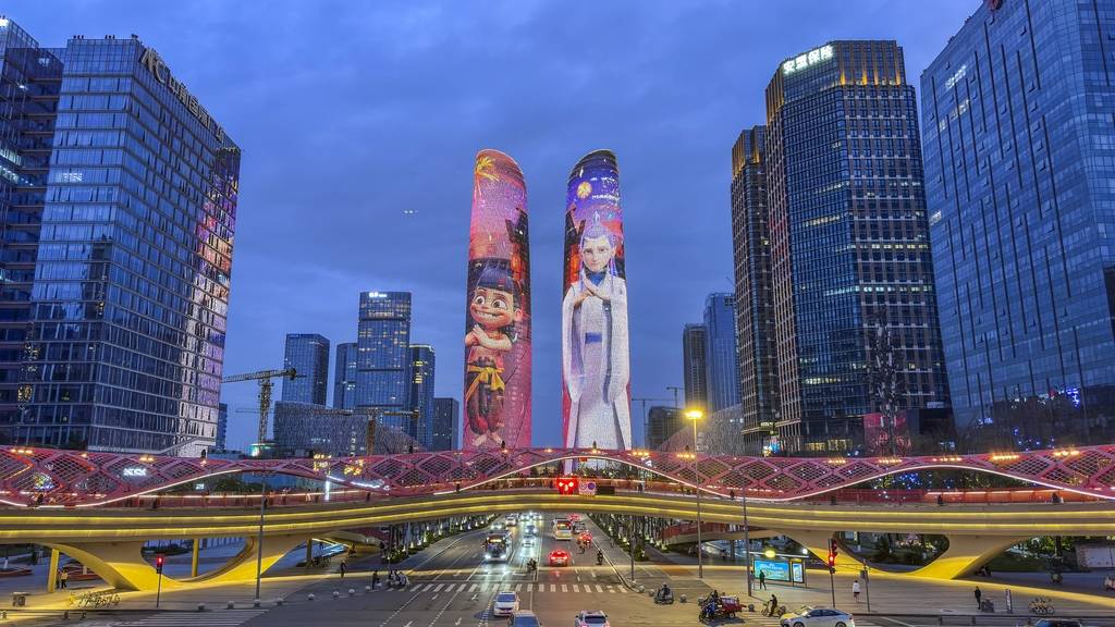 3月15日, 四川成都市雙子塔(天府國際金融中心),樓體屏幕顯示出《哪吒2魔童鬧海》圖像。圖源東方IC