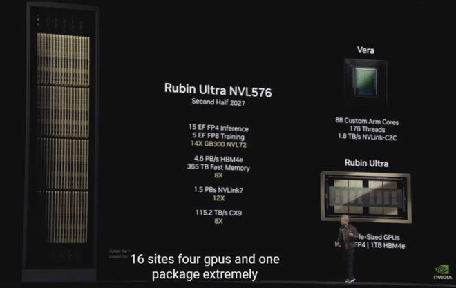 黃仁勳展示了 Vera Rubin NVLink576 的外觀和參數,並宣稱Rubin 的性能可達 Hopper 的 900 倍,而 Blackwell 是 Hopper 的 68 倍。