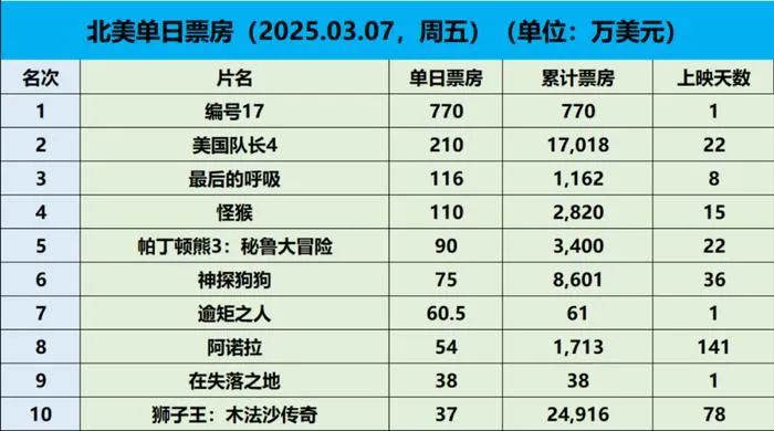 在老片方面,《美國隊長4:美麗新世界》公映四周後讓出榜首,本土累計票房達到1.76億美元,剛好超過第一部《美國隊長》的總收益,但衝擊2億關口的機會較為渺茫;《最後的呼吸》和由温子仁監製的《怪猴》則分別下滑一席,後者以逾3千萬美元暫居年度恐怖片之冠。橫掃奧斯卡頒獎禮的《阿諾拉》新增1130家影院,週末收成環比上升5倍後重返前列,後續仍有望突破2千萬美元。