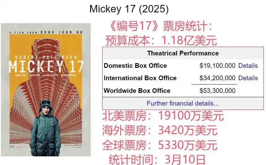 據Comscore統計,《編號17》共進軍68個國家和地區,北美之外的收益為2450萬美元,再加上提前一週公映的市場,全球累計票房達到5330萬美元。具體來看,《編號17》在韓國雙週共吸引逾209萬人次,以超過2百億韓元暫居年度次席,摺合接近1500萬美元。此外,《編號17》在中國內地落袋140萬美元,法國(282萬美元)、英國(270萬美元)和德國(130萬美元)也突破百萬關口。不過,《編號17》的淨製作費據信高達1.18億美元,後續回本無疑是一項艱鉅的任務。