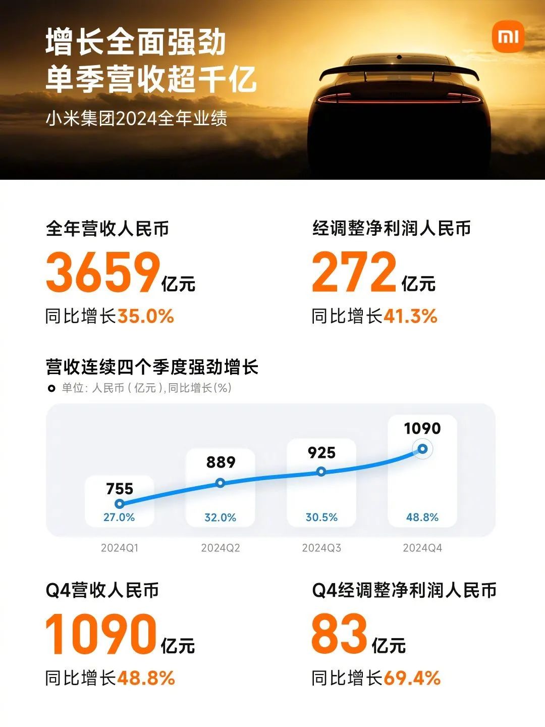 2024年,小米集團總收入達到3659億元,同比增長35%,創下歷史新高。其中第四季度的數據更為炸裂,收入1090億元,同比增長48.8%,歷史首次單季度突破千億營收!