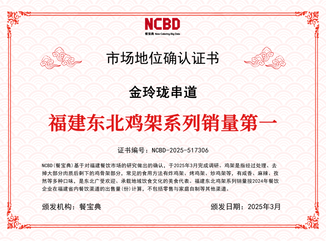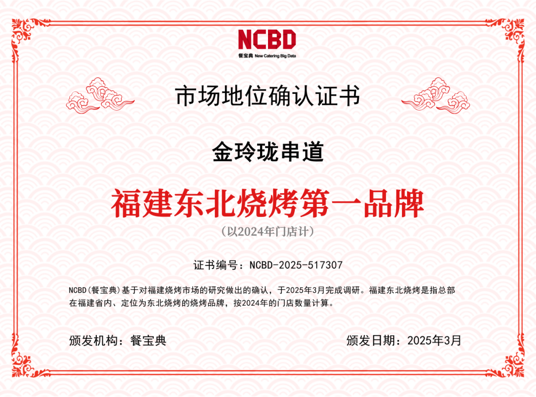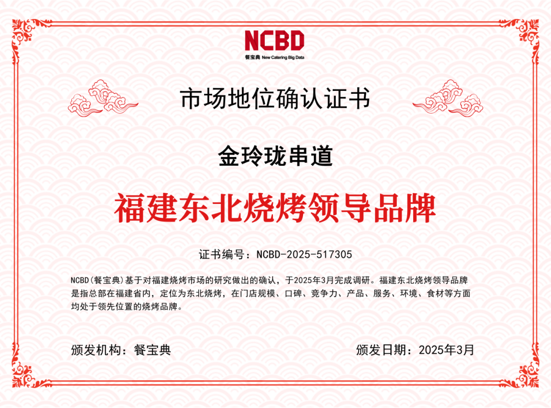 2025年3月,福建知名燒烤品牌**“金玲瓏串道”獲得由餐飲大數據研究與認證機構NCBD(餐寶典)授予的三項市場地位確認:“福建東北燒烤第一品牌**(以2024年門店計)”“福建東北燒烤領導品牌”“福建東北雞架系列銷量第一”。
