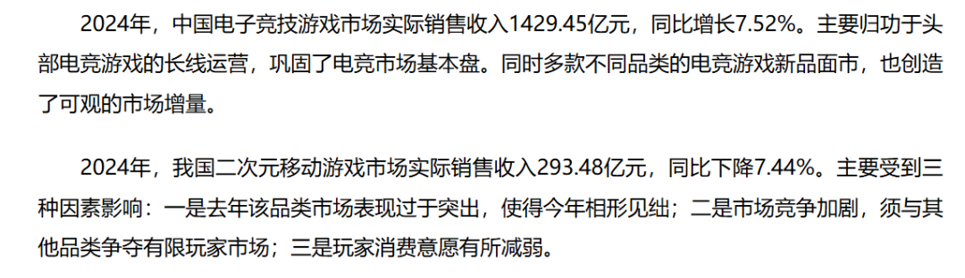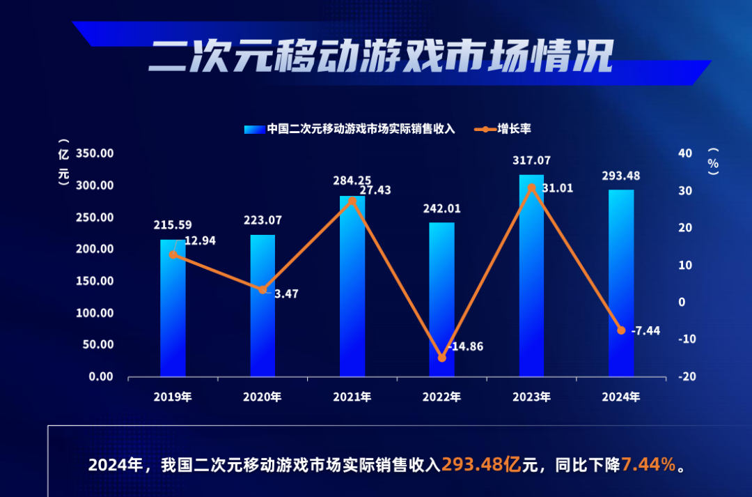 根據人民網發佈的《 2024 年中國遊戲產業報告 》,去年我國二次元移動遊戲市場整體實際銷售收入 293.48 億元,同比下降了 7.44%,同時面臨着競爭激烈、用户付費意願降低的問題。
