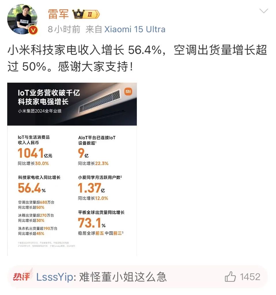 IoT 與生活消費產品業務的營收,第一次突破了 1000 億元,空調、冰箱和洗衣機全賣瘋了,雷軍還單獨把 IoT 業務單獨拎出來,發了條微博。