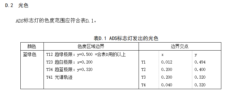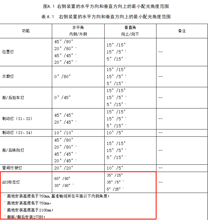 裏面詳細規定了 “ADS標誌燈” 的位置、數量、顏色、發光強度、配光角度等具體細節。