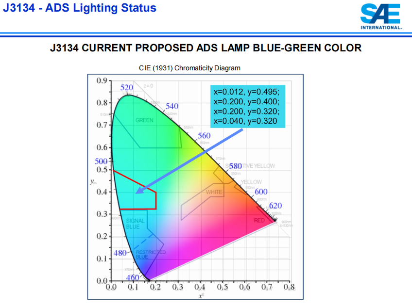 在一步步的學術討論中,SAE 最終在 2019 年推出了 J3134 推薦性技術標準,屏幕方案被放棄,將智駕提示燈確定為藍綠色。