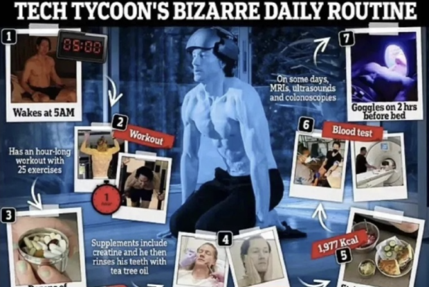 “ChatGPT之父”Sam Altman,天天磕糖尿病藥物防衰老,還要每天在“寒冷、黑暗、安靜的房間裏睡覺”;谷歌技術總監Ray Kurzweil不但每天花費2萬美元服用250粒藥丸;鏡像人工智能公司Mirror AI創始人塞吉·法蓋特,為了“長生不老”把自己變成了行走的藥罐子,每天都會吞下一堆藥片,其中包括不少違禁藥物,還會給自己注射一種合成人類生長激素;科技富豪Bryan Johnson為了“重返”18歲,每年花200萬美元保養身體,包括不限於五點起牀鍛鍊、全素飲食控制卡路里、全方位監測七十多種器官——通過血液測試、核磁共振、超聲波和結腸鏡等一系列檢查,不斷監測生命體徵和生化指標,就連睡覺都要連接機器監測下體……