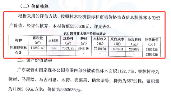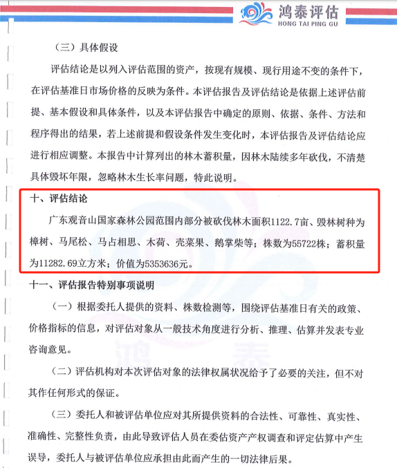 2023年,東莞觀音山管理方委託大連鴻泰海洋資源資產價格評估有限公司出具的評估報告書顯示:東莞觀音山景區內部分森林被毀面積為1122.7畝,尚未包括 “三項工程”和墳地、豪華別墅等等的毀林面積。東莞觀音山範圍內部分被砍伐林木面積1122.7畝,毀林樹種為樟樹、馬尾松、馬佔相思、木荷、殼菜果、鵝掌柴等。