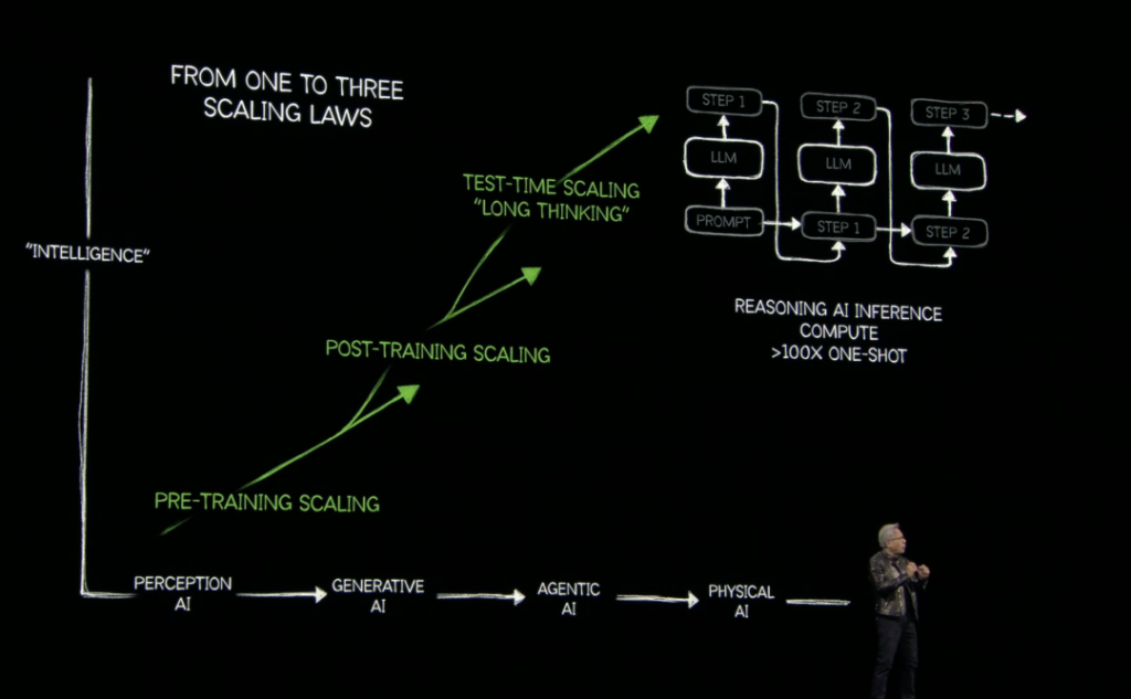 黃仁勳在GTC大會上坦然承認:“DeepSeek-R1的工程優化令人興奮不已,它證明了AI效率的突破。”但緊接着話鋒一轉:“但這只是冰山一角。後訓練(post-training)才是智能的核心,而它需要海量算力支撐。”更直言不諱地駁斥市場誤判:“有人認為DeepSeek-R1‘從天而降’後,不需要再做任何計算了。但事實恰恰相反——推理仍然是算力密集的。”其回應,堪稱矛盾藝術的典範。