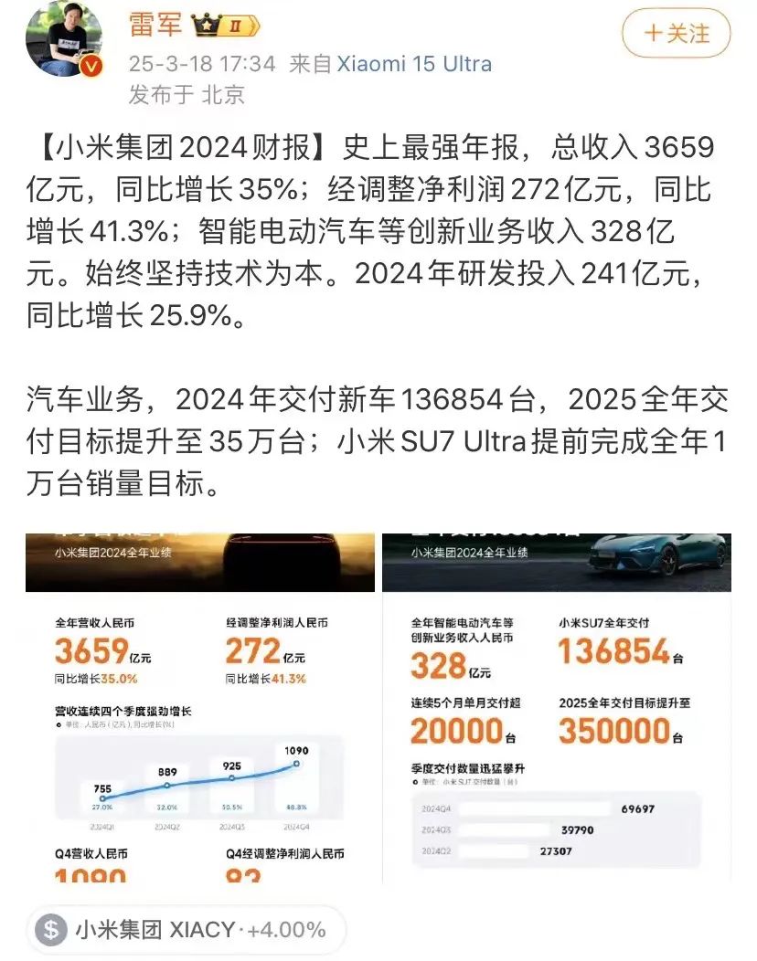 小米2024年四季度營收史上首破千億,經調整淨利潤83億元,創歷史新高;一個創紀錄的四季度也貢獻出了一個歷史新高的3659.1億元的全年營收。