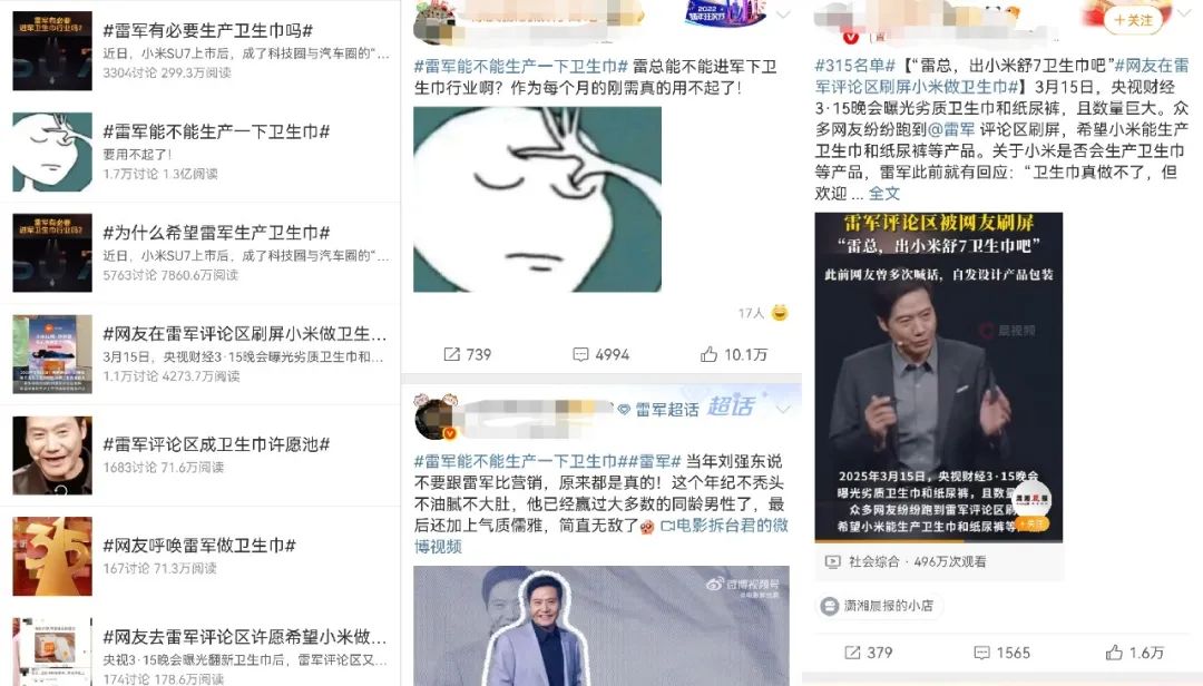 但“人民的首富”雷軍在“製造一切、售賣一切、包辦一切”的道路上可能不會停下來了。畢竟這屆315晚會曝光衞生巾和紙尿褲問題之後,眾多網友的第一反應也是跑到雷軍微博下刷屏“請求小米生產”。