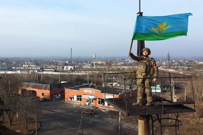 當地時間3月13日,俄羅斯庫爾斯克地區蘇賈市,俄軍舉起空降兵旗幟。(圖源:互聯網)
