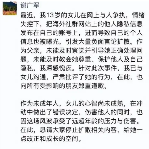 眼看事情愈發不可收拾,謝廣軍在朋友圈發文道歉了,承認女兒錯誤的同時,還説了數據是從海外社羣來的,跟公司沒有關係。
