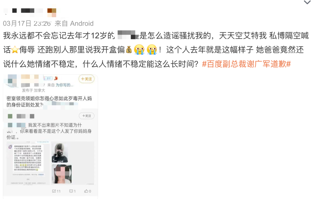 還有人站出來爆料,説這人前科累累,在不止一個圈子裏搞過開盒和網暴。