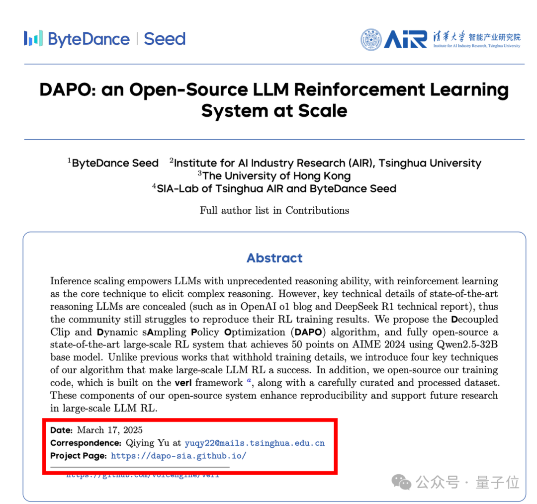 這個算法名為DAPO,字節、清華AIR聯合實驗室SIA Lab出品,現已開源。
