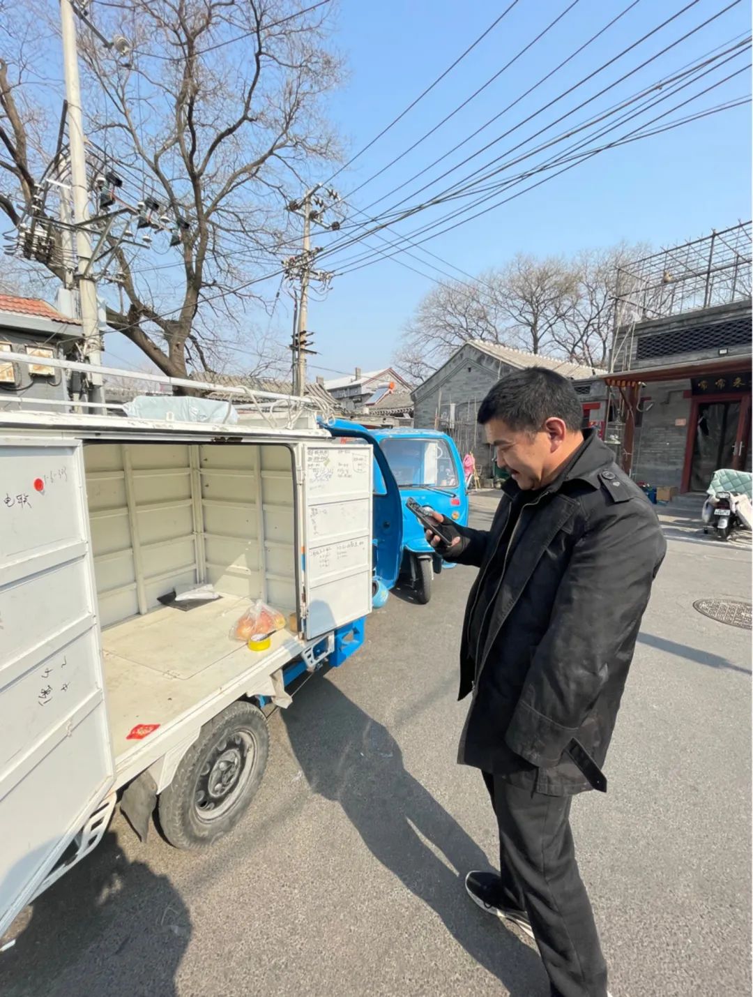 他的快遞車停在北二環的衚衕裏。他從車上下來,打開快遞車廂門,用牙咬掉筆蓋,在袋子上寫編碼,“這個是要退的”,他小聲唸叨道。
