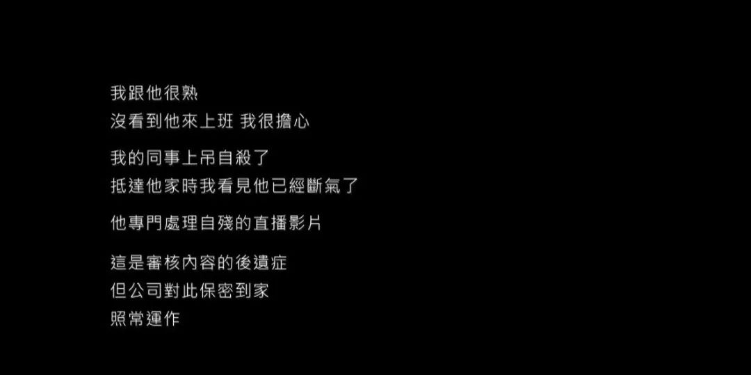 一位專門審查自殺內容的同事,在幾次申請調離工作未果後,最終上吊自殺。